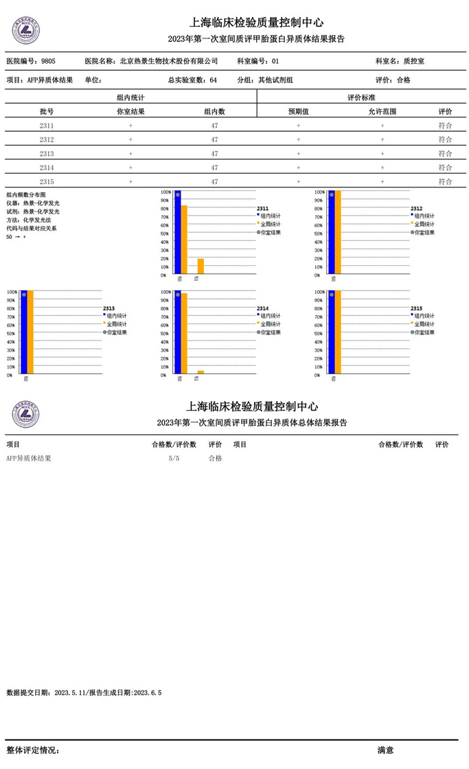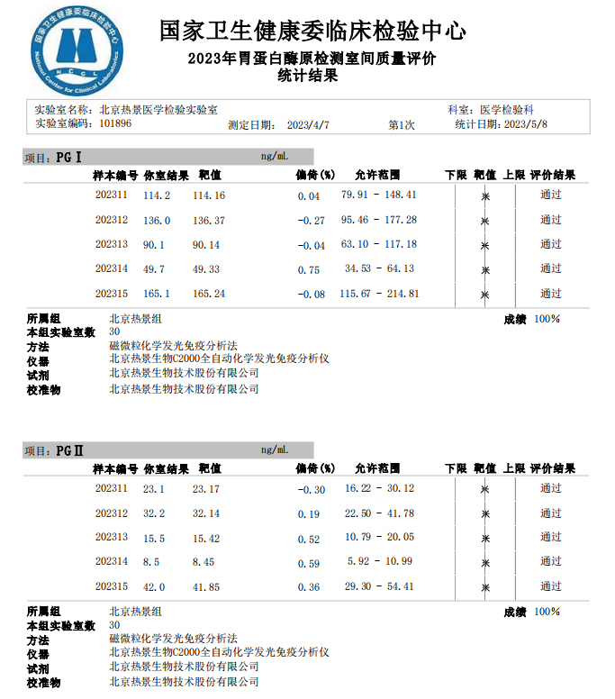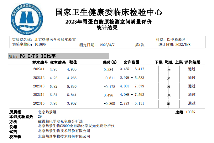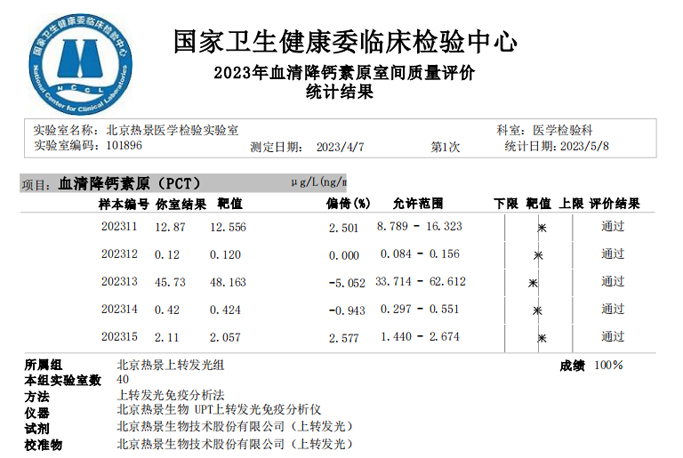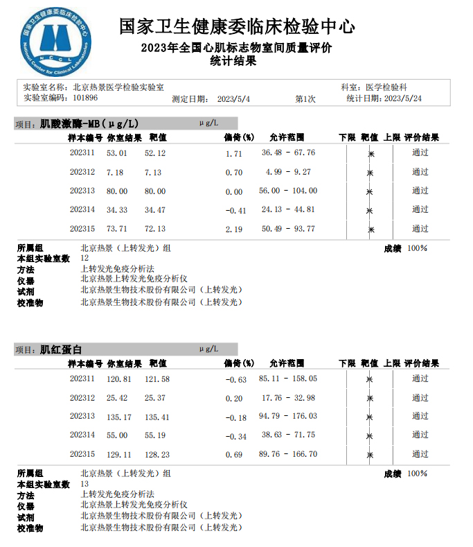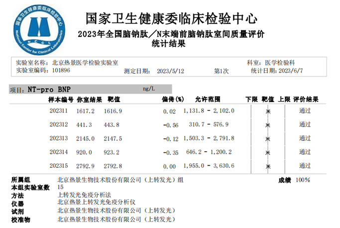 近日,國家衛(wèi)生健康委臨床檢驗中心(NCCL)公布了2023年多項全國臨床檢驗室間質量評價結果。熱景生物旗下熱景醫(yī)學檢驗實驗室以100分的優(yōu)異成績通過“胃蛋白酶原”“血清降鈣素原”“N末端前腦鈉肽”“心肌標志物”等室間質評項目。同時,熱景生物參與的上海市臨床檢驗中心2023年第一次能力驗證項目,包括B型鈉尿肽/N端-B型鈉尿肽前體、AFP異質體比率、肌鈣蛋白I、降鈣素原等項目均通過驗證,充分彰顯了熱景生物穩(wěn)定可靠的實驗室質量管理和檢測能力,以及強大的產(chǎn)品和技術實力!