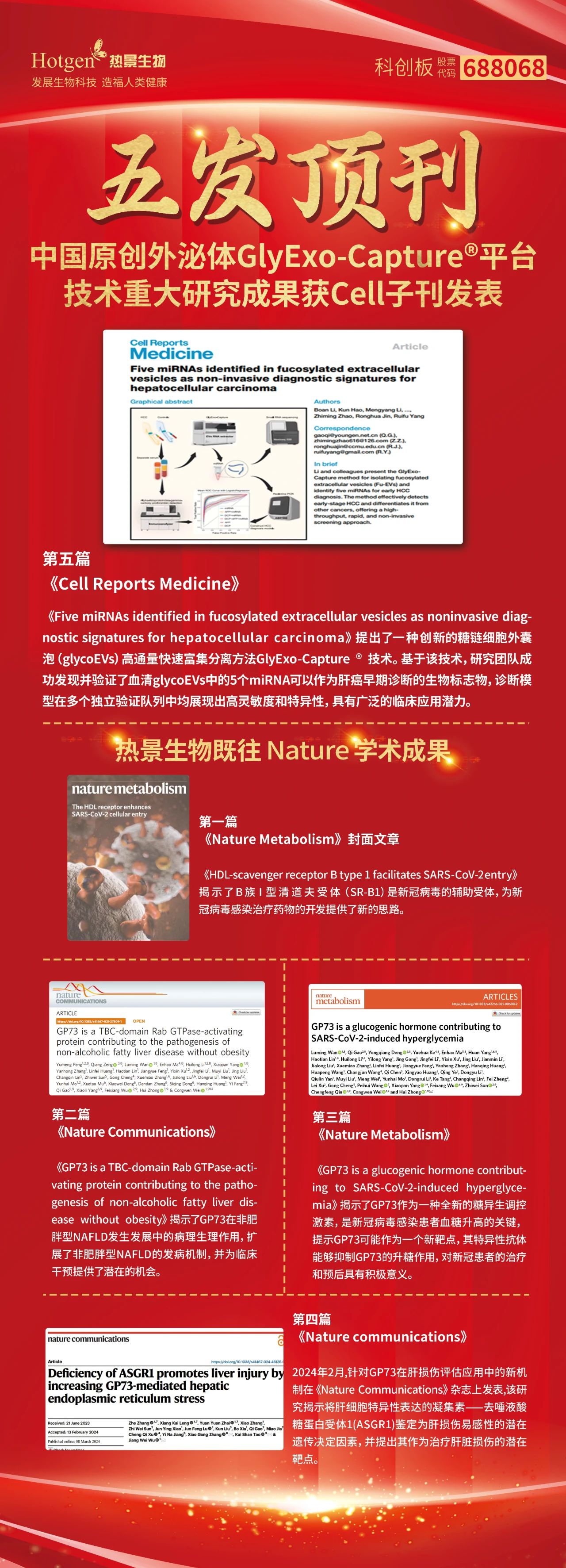 GIyExo-Capture?平臺(tái)是中國(guó)IVD科研創(chuàng)新創(chuàng)造的一個(gè)典范,針對(duì)全球范圍內(nèi)外泌體液體活檢應(yīng)用準(zhǔn)確率不高,操作繁瑣等臨床應(yīng)用挑戰(zhàn),提供了創(chuàng)新的解決方案。該平臺(tái)采用糖捕獲技術(shù),實(shí)現(xiàn)疾病相關(guān)外泌體全自動(dòng)、快速高通量分離,以及外泌體運(yùn)載microRNA的高靈敏度檢測(cè)。目前,熱景生物具有自主專利GIyExo-Capture?平臺(tái)開(kāi)發(fā)的系列癌癥早期診斷成果陸續(xù)通過(guò)注冊(cè)檢驗(yàn)(胰腺癌、肝癌、胃癌等),相關(guān)神經(jīng)退行性疾病研發(fā)項(xiàng)目進(jìn)展順利。作為糖捕獲診斷方法學(xué)的提出者,熱景生物致力于將中國(guó)企業(yè)的原創(chuàng)性技術(shù)推廣應(yīng)用到全球臨床,為全球患者帶來(lái)更精準(zhǔn)、更便捷的診斷方案、使更多患者獲益于中國(guó)創(chuàng)新技術(shù)。