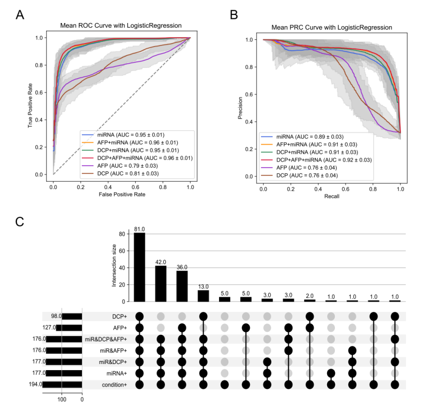 為進(jìn)一步提高模型的診斷性能,我們將miRNA靶標(biāo)與AFP/DCP特征結(jié)合。結(jié)果顯示,結(jié)合后模型的ROC-AUC值提升至0.96,PRAUC值達(dá)到0.91(圖3A-B)。此外,基于該聯(lián)合特征的模型對(duì)194例HCC患者的總體靈敏度達(dá)到90.70%,顯著高于單獨(dú)使用miRNA靶標(biāo)時(shí)的88.06%(圖3C)。這表明miRNA與蛋白特征之間具有互補(bǔ)作用,顯著增強(qiáng)了HCC的診斷準(zhǔn)確性。