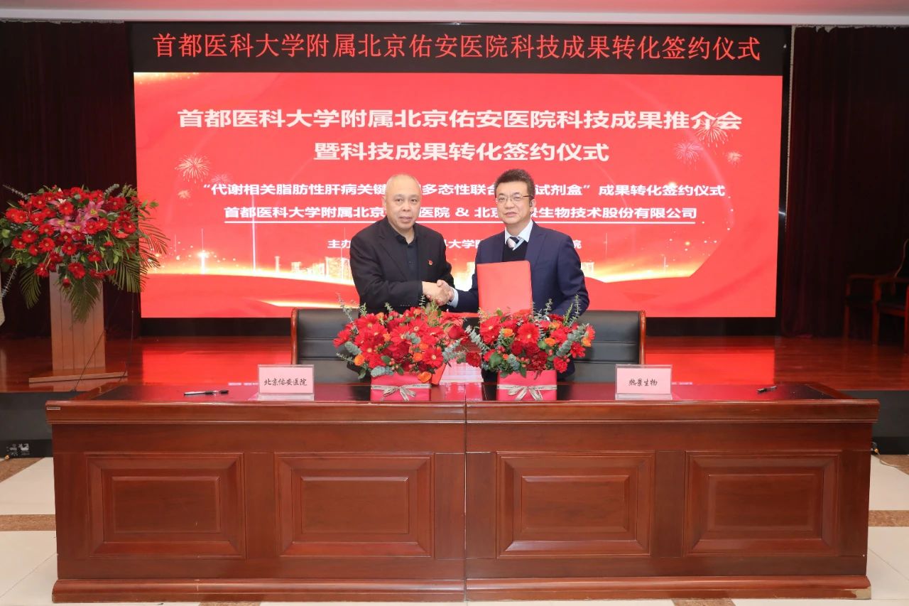 馬迎民院長代表我院與大興區(qū)上市企業(yè)熱景生物就肝病中心三科張晶主任主導(dǎo)研發(fā)的“代謝相關(guān)脂肪性肝?。∕AFLD)關(guān)鍵基因多態(tài)性聯(lián)合檢測試劑盒”簽訂轉(zhuǎn)化協(xié)議。