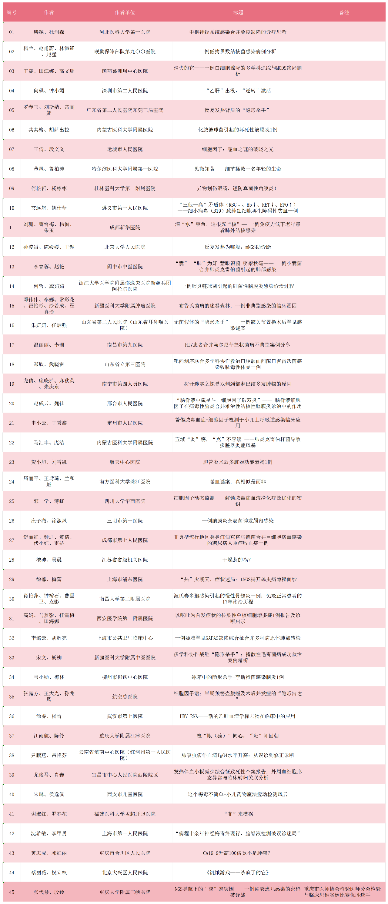 為了有效推動(dòng)檢驗(yàn)與臨床的深度融合,進(jìn)一步提升檢驗(yàn)人員的臨床思維能力,在中華醫(yī)學(xué)會(huì)檢驗(yàn)醫(yī)學(xué)分會(huì)青年學(xué)組指導(dǎo)下,西部數(shù)智醫(yī)療研究院、《檢驗(yàn)醫(yī)學(xué)》雜志、檢驗(yàn)醫(yī)學(xué)新媒體主辦,白求恩精神研究會(huì)檢驗(yàn)醫(yī)學(xué)分會(huì)細(xì)胞因子與疾病檢測(cè)學(xué)組、北京熱景生物技術(shù)股份有限公司協(xié)辦的「第五屆檢驗(yàn)與臨床(感染性疾病)思維案例展示活動(dòng)」已全面啟動(dòng)。在面向全國(guó)進(jìn)行征稿,并對(duì)稿件進(jìn)行雙盲雙審(同一篇稿件均由2位專家進(jìn)行評(píng)審)后,根據(jù)評(píng)審結(jié)果,共納入復(fù)審稿件45篇。以下為詳細(xì)名單,排名不分先后。