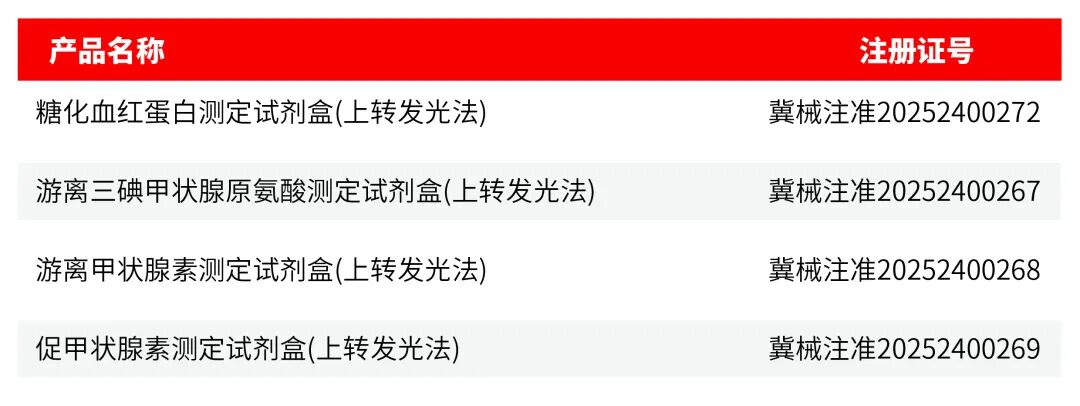 近日,熱景生物基于上轉(zhuǎn)發(fā)光(UPT)技術(shù)的 4 項醫(yī)療器械產(chǎn)品,成功拿下國家藥監(jiān)局《醫(yī)療器械注冊證》!此次獲批的甲功三項(FT3、FT4、TSH)與糖化血紅蛋白檢測項目,不僅是公司技術(shù)實力的權(quán)威認(rèn)證,更將為臨床診療與慢性病管理帶來便捷新選擇。