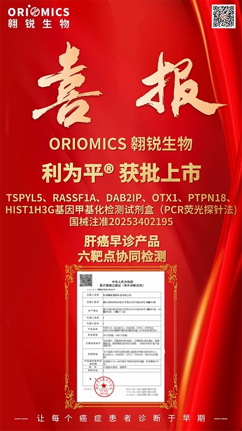 近日,熱景生物重要參股公司翱銳生物自主研發(fā)的利為平?——TSPYL5、RASSF1A、DAB2IP、OTX1、PTPN18、HIST1H3G基因肝癌甲基化檢測(cè)試劑盒(PCR熒光探針?lè)ǎ┇@得國(guó)家藥品監(jiān)督管理局頒發(fā)的Ⅲ類醫(yī)療器械注冊(cè)證(注冊(cè)證號(hào):國(guó)械注準(zhǔn)20253402195)。該產(chǎn)品用于體外定性檢測(cè)人血漿中相關(guān)基因甲基化,適用于臨床上對(duì)疑似原發(fā)性肝癌的輔助診斷。