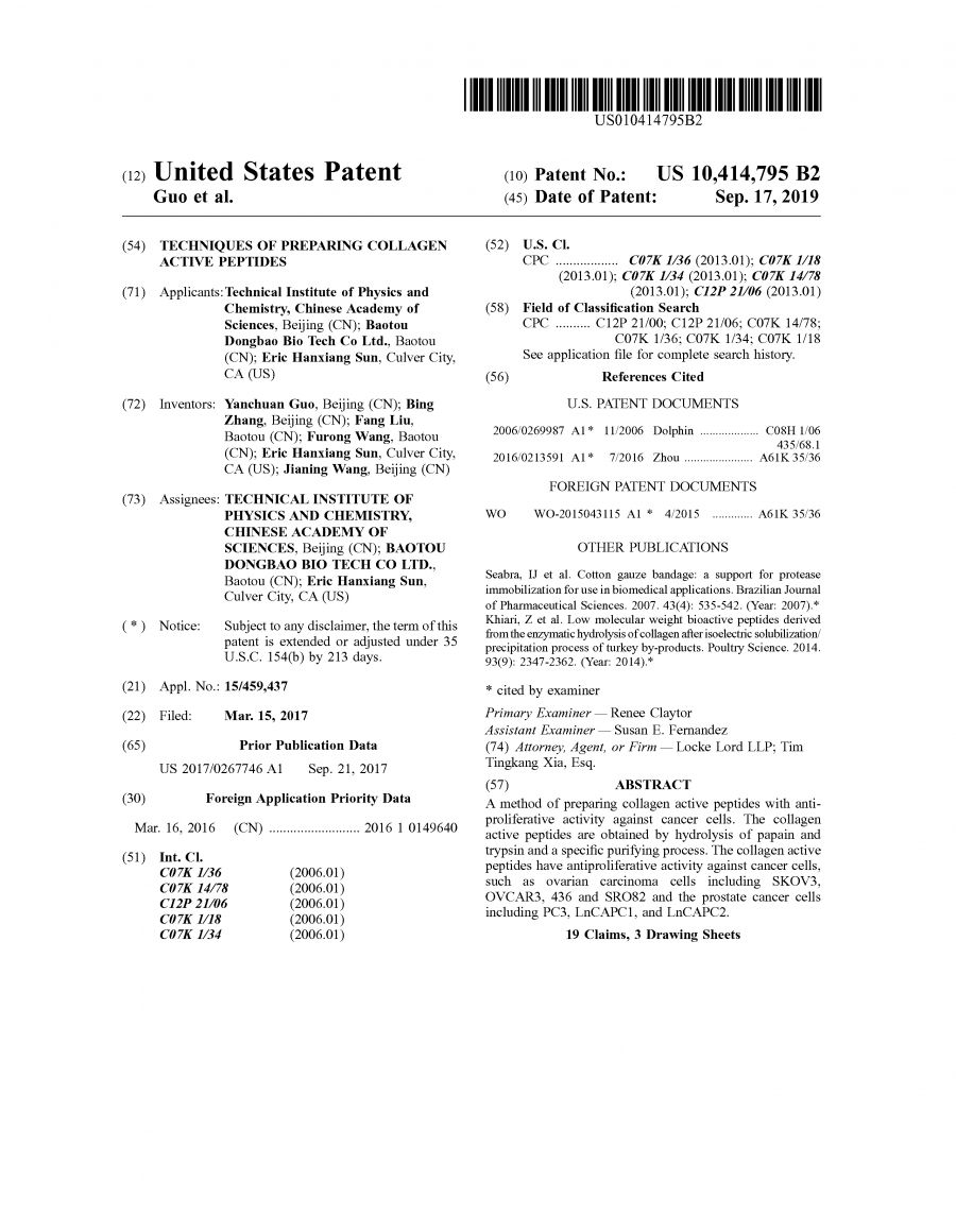 專利名稱:《TECHNIQUES OF PREPARING COLLAGEN ACTIVE PEPTIDES》(膠原蛋白活性肽制備技術(shù))