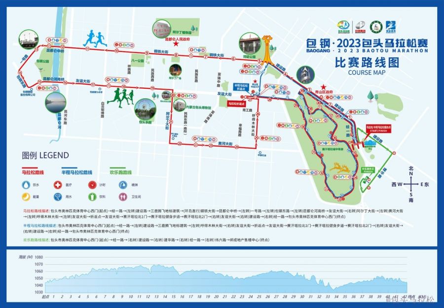 圓素提示:包頭馬拉松賽將于6月23日7點30分開跑,所有參賽選手領取物料時間為6月20日(周二)9:00 — 18:00、6月21日(周三)9:00 — 18:00、6月22日(周四)9:00 — 21:00,地點為包頭奧林匹克體育中心(北門),比賽路線圖如下: