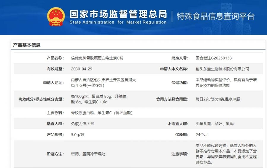 作為深耕膠原60余年的東寶生物推出的膠原+系列產(chǎn)品“倍優(yōu)免牌骨膠原蛋白維生素C粉”(注冊(cè)批準(zhǔn)證號(hào):國(guó)食健注G20250138),正是在這樣的市場(chǎng)背景下孕育而生。本品具有“有助于增強(qiáng)免疫力”的保健功能,可作為亞健康人群、中老年人日常營(yíng)養(yǎng)補(bǔ)充的選擇,也有助于滿(mǎn)足關(guān)注健康管理的青年及職場(chǎng)人士對(duì)提升狀態(tài)的需求。